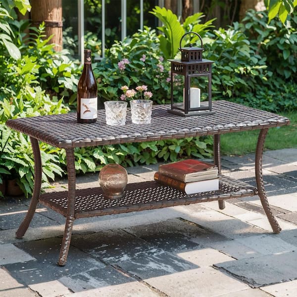 Brown Rectangle Wicker Outdoor Coffee Table with Lower Storage Shelf PE Rattan Side Table for Patio