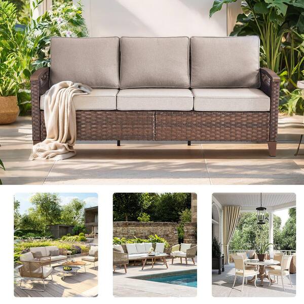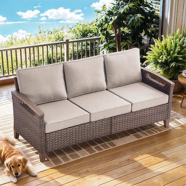 Farmhouse 3-Seat Brown PE Wicker Outdoor Couch with Olefin Beige Cushions/Metal Armrest