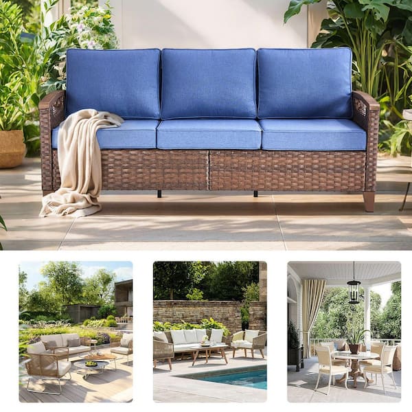 Farmhouse 3-Seat Brown PE Wicker Outdoor Couch with Olefin Blue Cushions/Metal Armrest