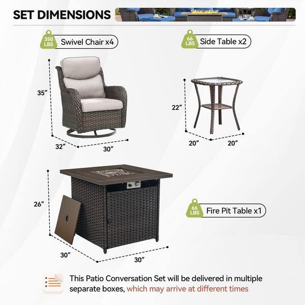 Luxury Brown Wicker Fire Pit Conversation Set with Olefin Beige Cushions and Patio Swivel Chairs/Side Tables
