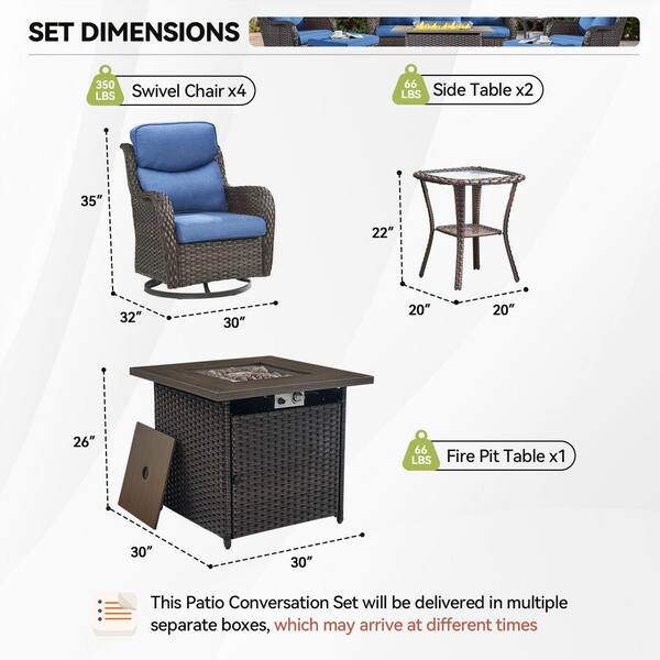 Luxury Brown Wicker Fire Pit Conversation Set with Olefin Blue Cushions and Patio Swivel Chairs/Side Tables (7-Piece)