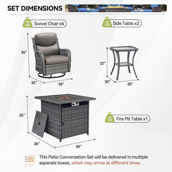 Luxury Gray Wicker Fire Pit Conversation Set with Olefin Gray Cushions and Patio Swivel Chairs/Side Tables (7-Piece)