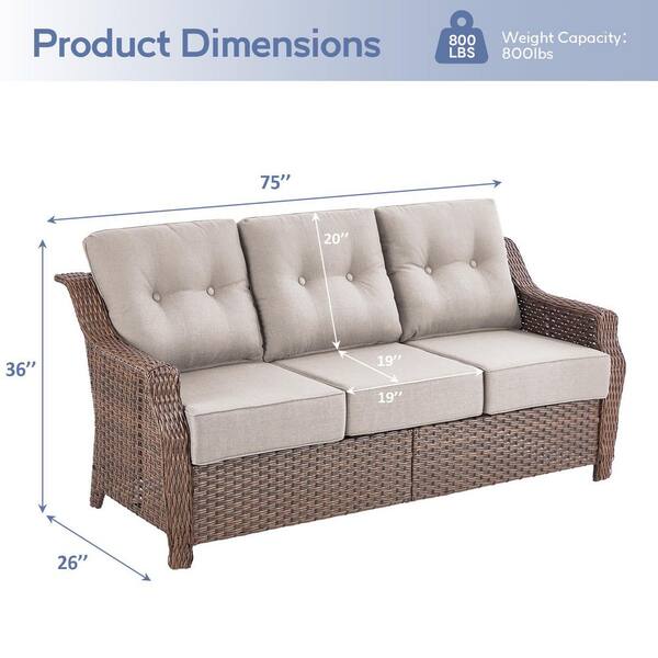 Modern Farmhouse 3-Seat Brown PE Wicker Outdoor Couch with 6 in. Olefin Beige Cushions/Wide Armrest