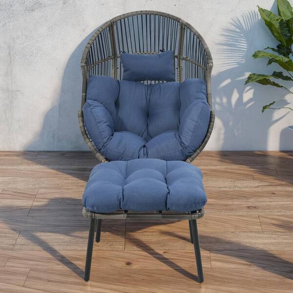 Patio Gray Wicker Large Glider Egg Chair Outdoor Lounge Chair with Blue Cushion and Ottoman