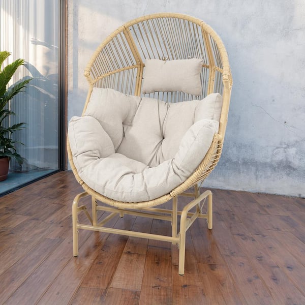 Patio Yellow Wicker Large Glider Egg Chair Outdoor Lounge Chair with Beige Cushion