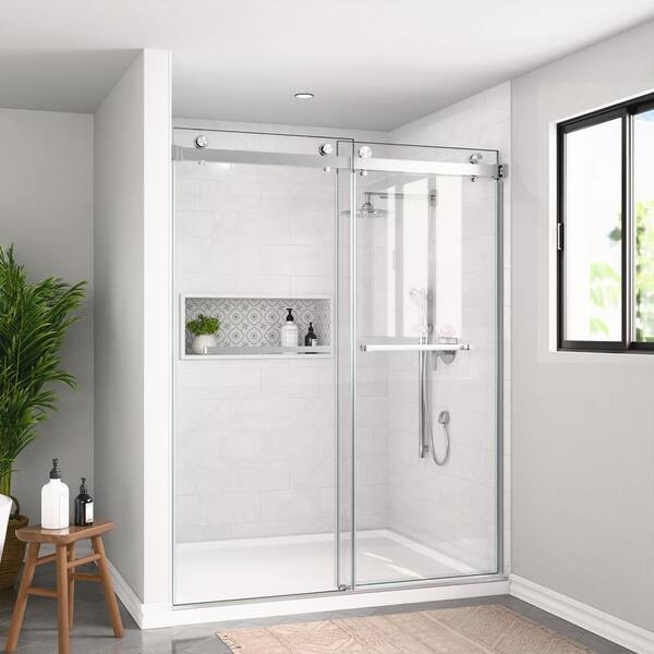 60 in. W x 80 in. H Double Sliding Frameless Shower Door in Brushed Nickel with 3/8 in. (10 mm) Tempered Clear Glass