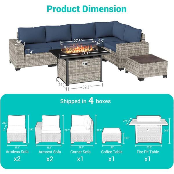 7-Piece Wicker Patio Conversation Set with 55,000 BTU Fire Pit Table and Glass Top Table with Navy Blue Cushions