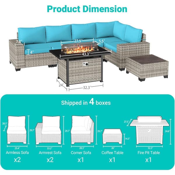 7-Piece Wicker Patio Conversation Set with 55,000 BTU Fire Pit Table and Glass Top Table with Turquoise Cushions