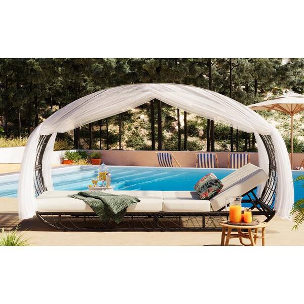 Patio Sunbed of 1-Piece Black Wicker Outdoor Day Bed 90.55" with Beige Cushions and Curtain Backrest Adjustable Recliner