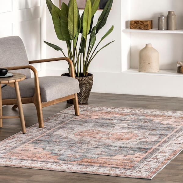 Banks Machine Washable Light Grey 4 ft. x 6 ft. Medallion Area Rug