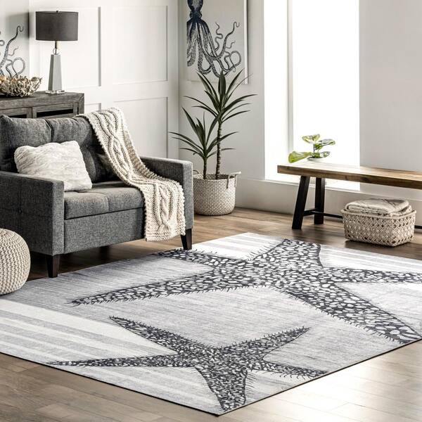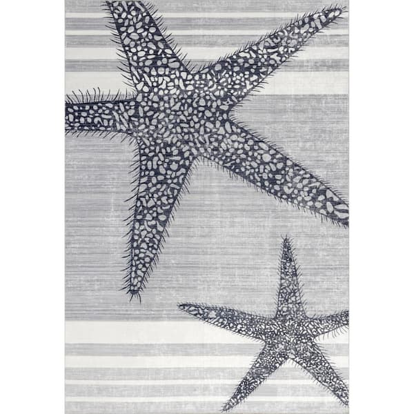 Starfish Machine Washable Light Gray 4 ft. x 6 ft. Starfish Graphic Area Rug