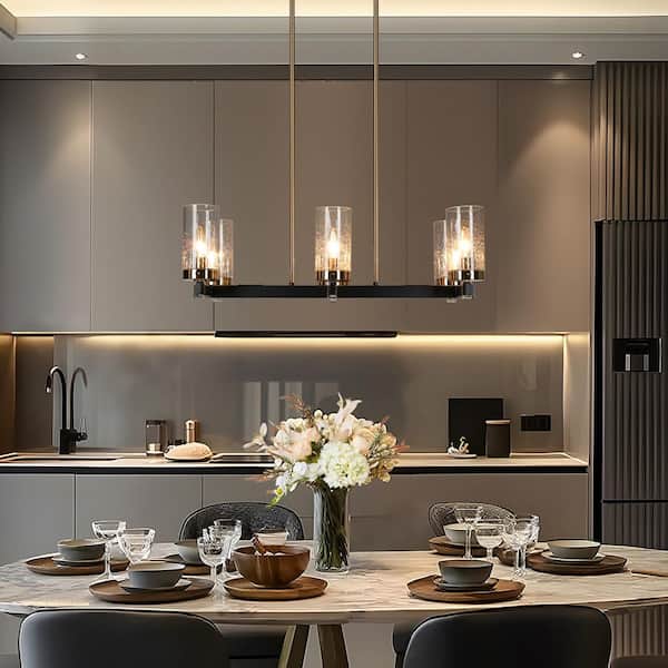 27 in. 6-Light Modern Black Chandelier, Farmhouse Chandelier with Seeded Glass Shade for Dining Room,Brass Pendant Light