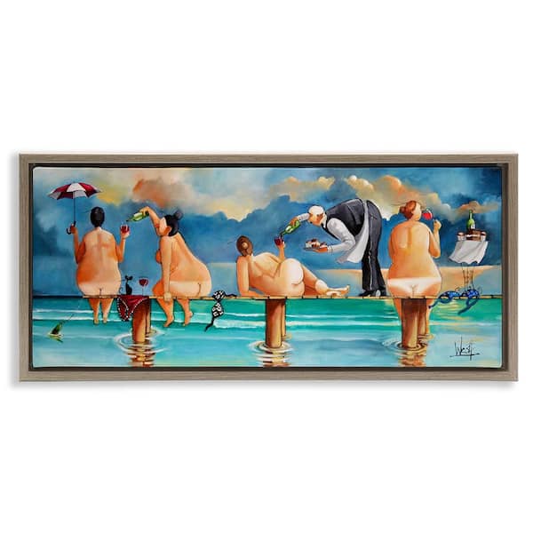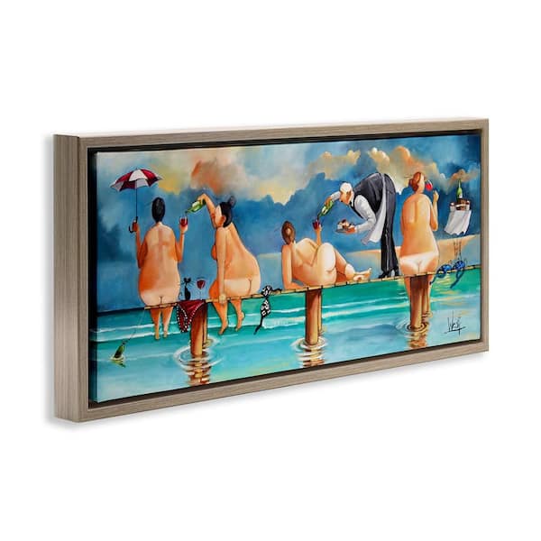 Nude Ladies Fun at Beach by Ronald West 1-Piece Brown Floater Frame People Graphic Art Print 11 in. x 25 in.