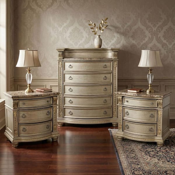 Rilon 3-Piece Gold Champagne 3-Drawer Set of 2 Nightstands and Chest with Genuine Marble Inset Top