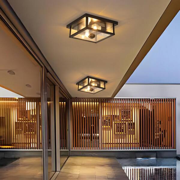 12.2 in. 2-Light Matte Black Motion Sensing Outdoor No Bulb Included Flush Mount Ceiling Light with Clear Glass