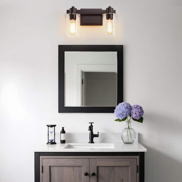 • Oil-rubbed bronze vanity light with clear glass shades
