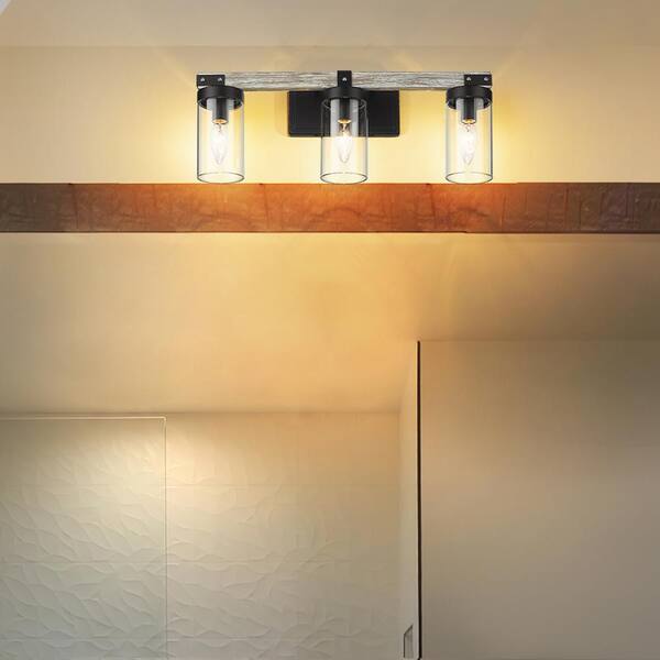 20.16 in. 3-Light Matte Black and Light Wood Grain Bathroom Vanity Light with Clear Glass Shades
