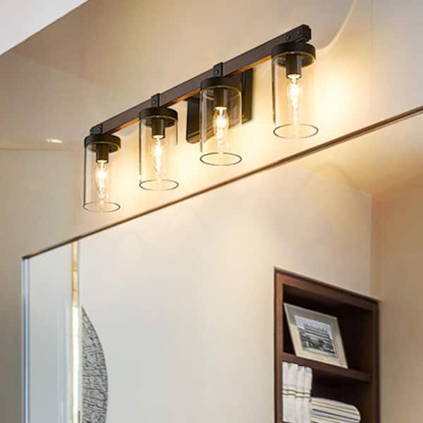 28.5 in. 4-Light Matte Black and Dark Wood Grain Bathroom Vanity Light with Clear Glass Shades