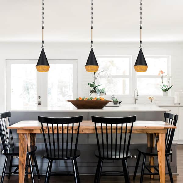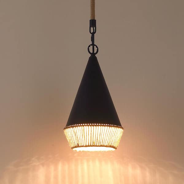 Farmhouse 1-Light Black Bohemian Island Pendant Light with Hemp Rope Shade