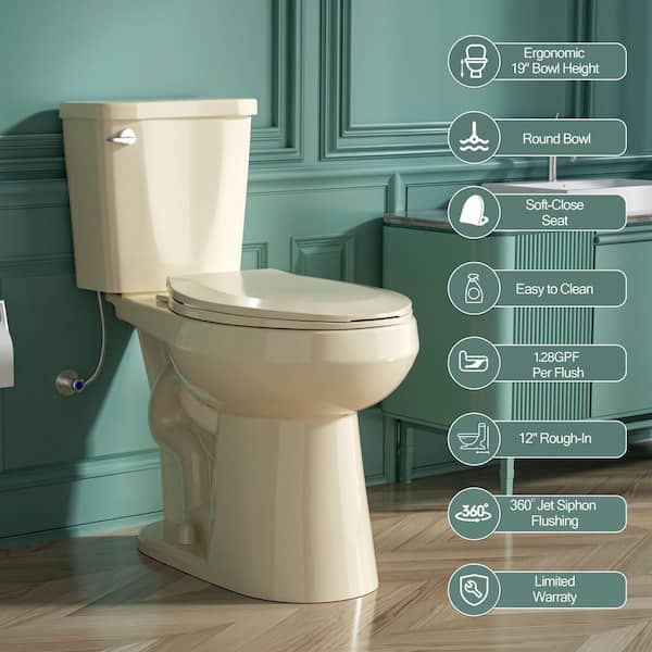 Be the first to ask a question for Kuomih 20 in. ADA Height Toilet 2-Piece 1.28 GPF Single Flush Round Heightened Toilet in Bone Soft-Close Seat 12 in. Rough in