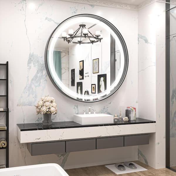 Questions and Answers for KeonJinn 36 in. W x 36 in. H Round Framed 3-Colors Dimmable LED Wall Mount Bathroom Vanity Mirror with Lights Anti-Fog in Black