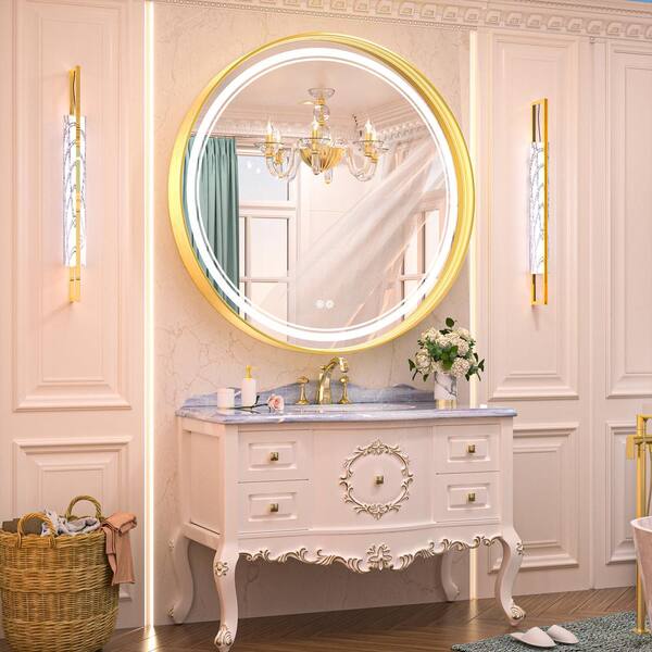 Questions and Answers for KeonJinn 36 in. W x 36 in. H Round Framed 3-Colors Dimmable LED Wall Mount Bathroom Vanity Mirror with Lights Anti-Fog in Gold