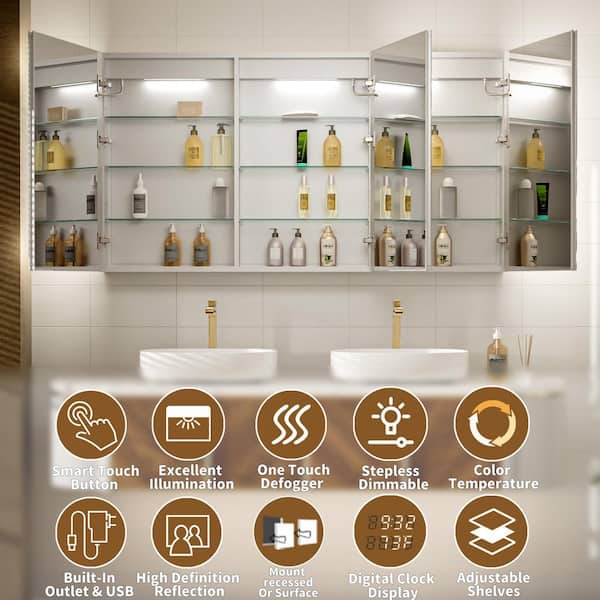 Questions and Answers for Lonni 60 in. W x 32 in. H Rectangular Silver Aluminum Recessed/Surface Mount LED Medicine Cabinet with Mirror And Clock