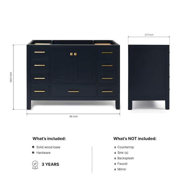 Be the first to ask a question for ARIEL Cambridge 48 in. W x 21.5 in. D x 34.5 in. H Freestanding Bath Vanity Cabinet Only in Midnight Blue