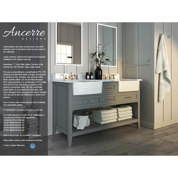 Be the first to ask a question for Ancerre Designs Hayley 60 in. W x 20.1 in. D x 34.6 H Bath Vanity in Sea Cloud Gray with Carrara White Marble Vanity Top