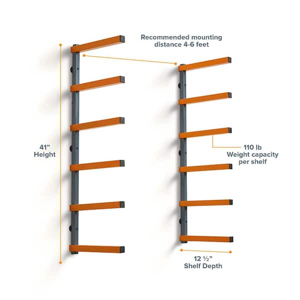 Questions and Answers for BORA 39.5 in. H x 72 in. W x 12.5 in. D 6-Level Orange/Gray Mounted Steel Garage Wall Shelf