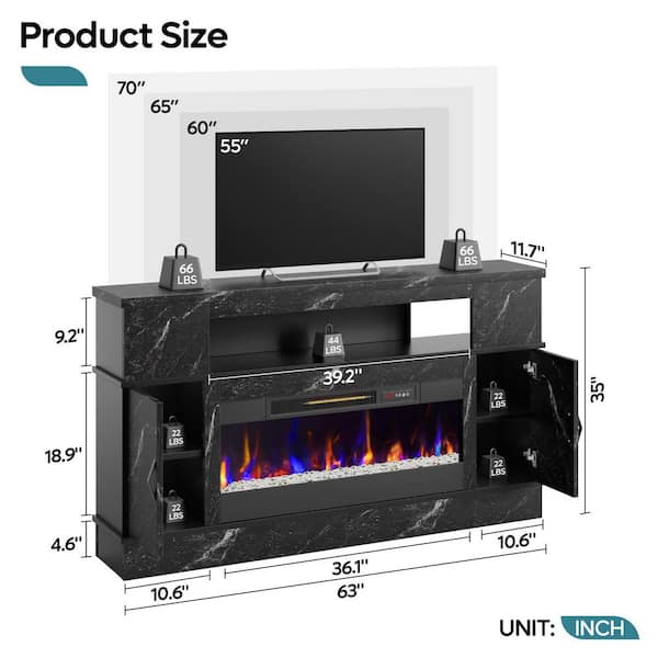 Questions and Answers for Bestier 63 in. Black Marble Freestanding Electric Fireplace TV Stand Fits TV Up to 70 in. Entertainment Center with Cabinet