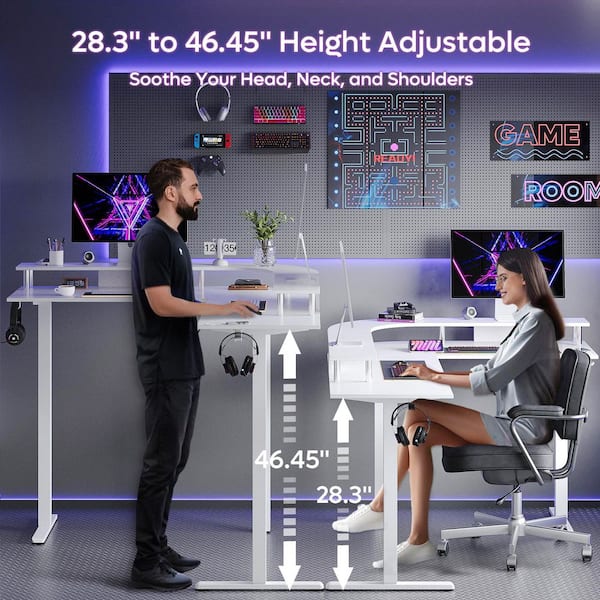 Questions and Answers for Bestier 63 in. L-Shaped White Carbon Fiber Wood Sit to Stand Desk with 3-Height Memory Presets and USB Port and Monitor Stand