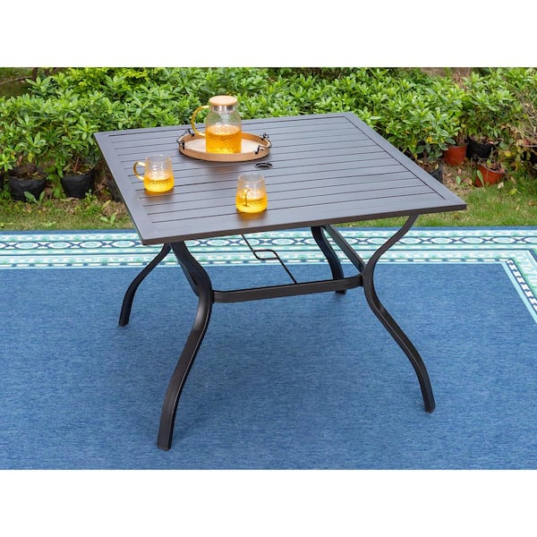 Questions and Answers for PHI VILLA Black 6-Piece Metal Patio Outdoor Dining Set with Blue Folding Reclining Sling Chairs and Beige Umbrella
