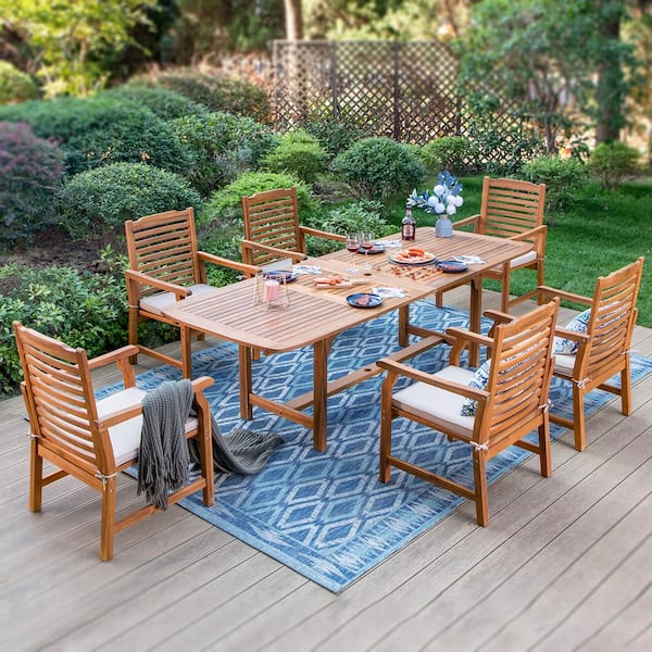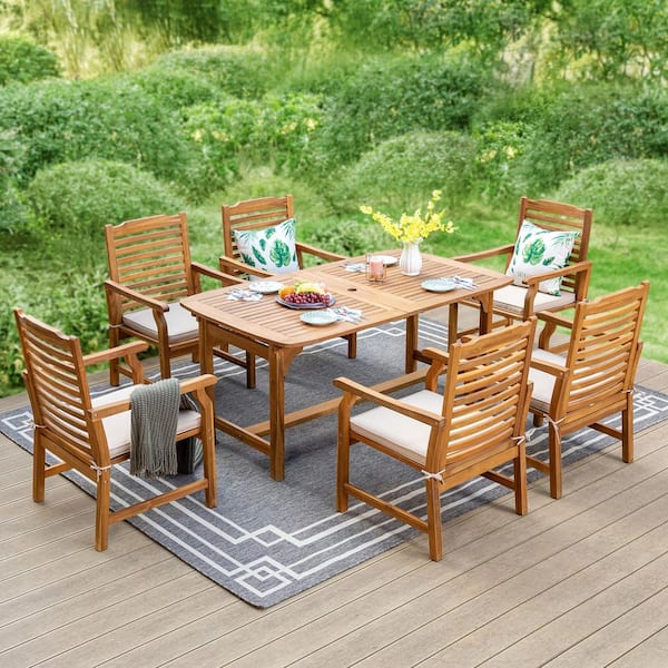 Questions and Answers for PHI VILLA Brown 7-Piece Wood Patio Outdoor Dining Set With Extendable Table and Wood Chairs With Beige Cushion
