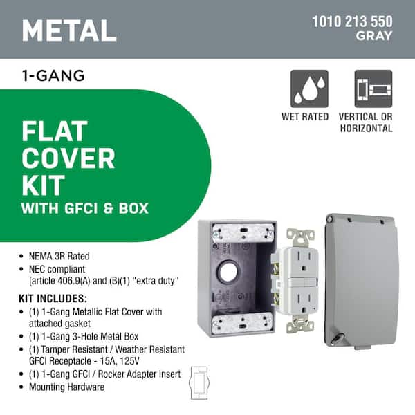 - Kit: Metal Box (1), 15A TR/WR GFCI (1), & Metal Flat Cover (1)