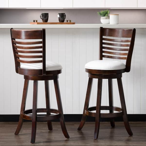 Questions and Answers for CorLiving Woodgrove 29 in. Wood Swivel Bar Stool with White Leatherette Seat and 6-Slat Backrest (Set of 2)