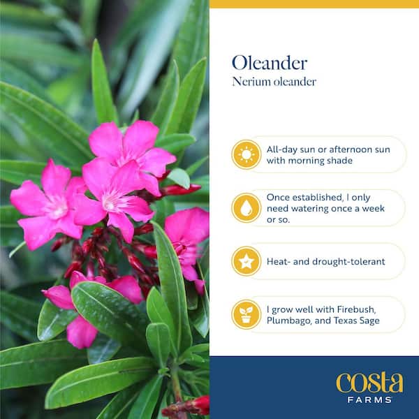 Be the first to ask a question for Costa Farms 10 in. Outdoor Pink Oleander Bush Plant in Grower Pot, Avg. Shipping Height 26 in. to 32 in. Tall