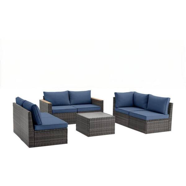 Gray Rattan Patio Furniture Set, 7-Pieces with Ottoman, Wicker Outdoor Sectional Sofa with Blue Cushions