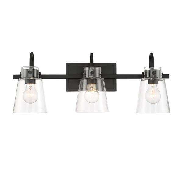 Be the first to ask a question for Designers Fountain Inwood 24 in. 3-Light Matte Black Modern Vanity Light with Clear Glass Shades
