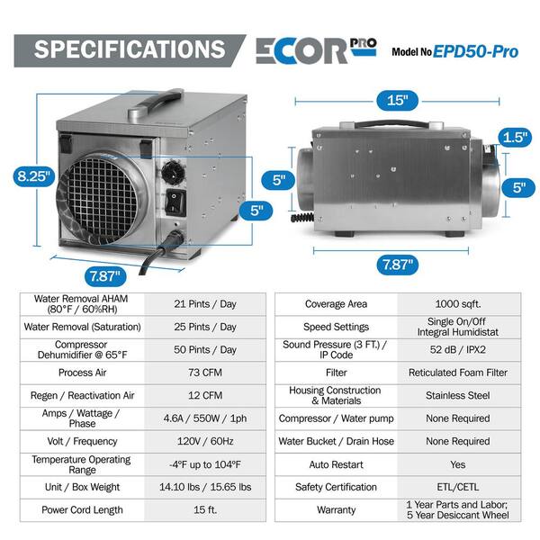 Questions and Answers for Ecor Pro 50 Pint Portable Commercial Desiccant Dehumidifier for Whole House, Bedroom, Bathroom, Crawl Space, Basement and Garage