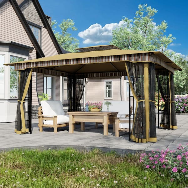 Questions and Answers for Esunny 13 ft. x 11 ft. Beige Outdoor Patio Steel Frame Soft Top Gazebo with Mosquito Netting and Weather-Resistant Canopy Top
