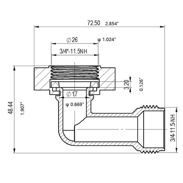 - Features 90-degree bend, rubber washer and 75 PSI max pressure