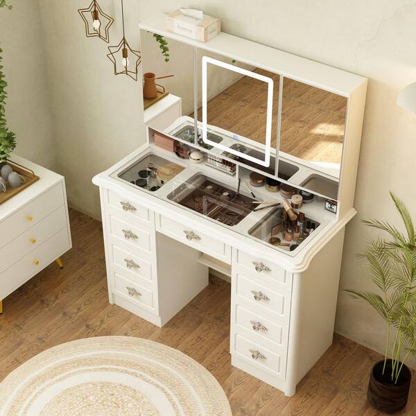 Questions and Answers for FUFU&GAGA White Makeup Vanity Table with 3-Mirrors, Glass Top, LED Lighted 9-Drawers, Hidden Storage Shelves, Carved Metal Handles