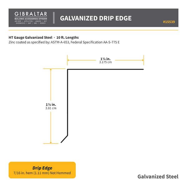 Be the first to ask a question for Gibraltar Building Products 1-1/4 in. x 1-1/2 in. x 10 ft. Galvanized Steel Drip Edge Flashing