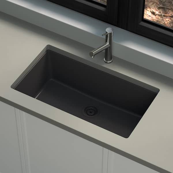 Questions and Answers for Glacier Bay Stonehaven 33 in. Undermount Single Bowl Black Onyx Granite Composite Kitchen Sink with Black Strainer