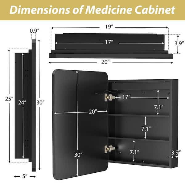 Questions and Answers for HOMEIBRO 20 in. x 30 in. Black Bathroom Medicine Cabinett with Mirror, Recessed or Surface Lighted Medicine Cabinet