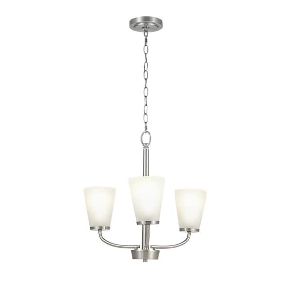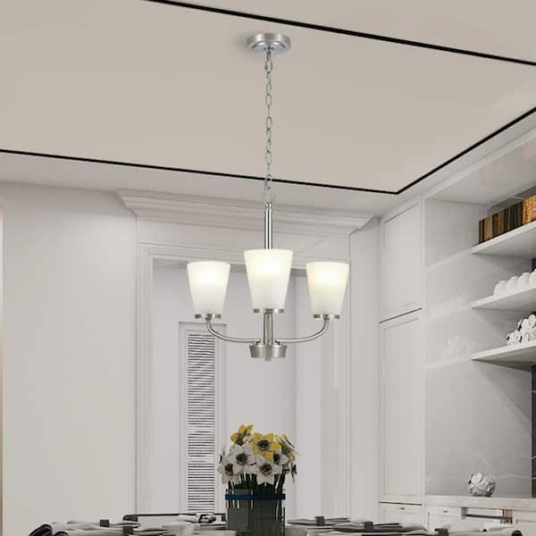 Questions and Answers for Hampton Bay Helena 19 in 3-Light Brushed Nickel Hanging Chandelier with Frosted Glass Shades for Dining Room