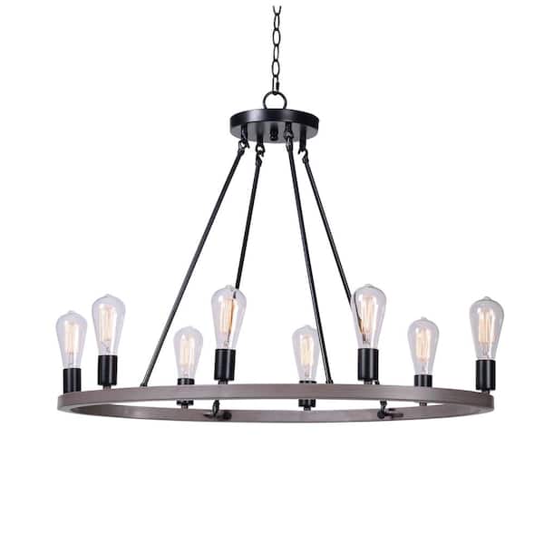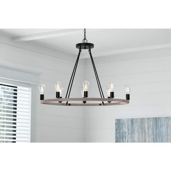 Questions and Answers for Hampton Bay Stratton 8-Light Black and Woodgrain Island Wagon Wheel, Industrial Farmhouse Dining Room Chandelier with Bulbs Included