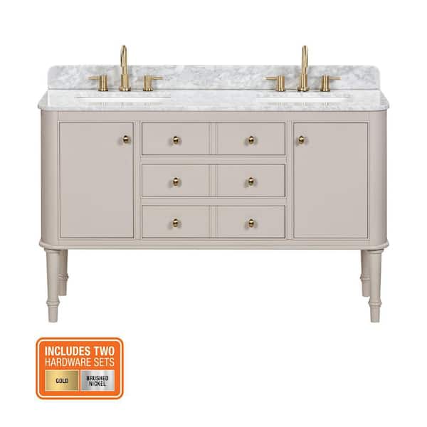 Questions and Answers for Home Decorators Collection Collette 60 in. Double Sink Greige Bath Vanity with White Carrara Marble Top (Assembled)