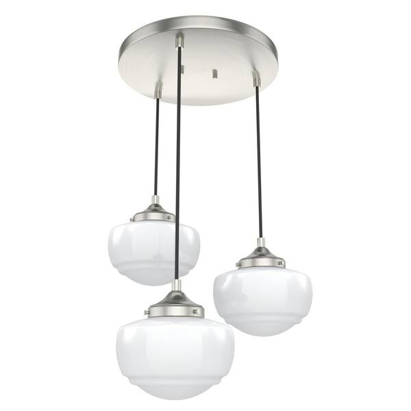 Questions and Answers for Hunter Saddle Creek 3-Light Brushed Nickel Schoolhouse Chandelier with Cased White Glass Shades